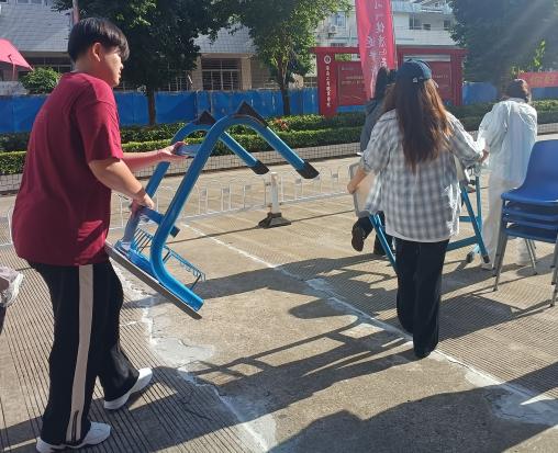 当日,迎新志愿者们准时在第一教学楼与第二教学楼中间集合,精神抖擞地开启迎新筹备工作。按照既定分工,志愿者团队迅速行动:一部分志愿者先将提前领取的帐篷转运至学院迎新点位,另一部分志愿者则前往指定区域搬运桌椅,大家相互配合、高效协作,现场忙碌而有序。