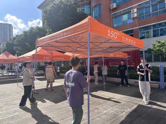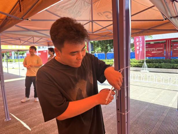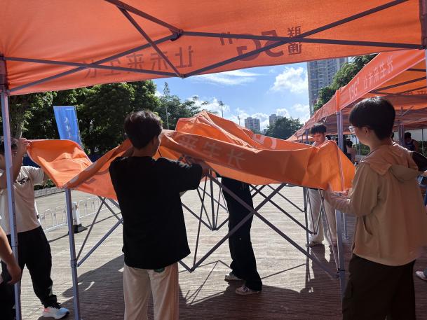 随后,志愿者们共同发力,将 15 顶帐篷逐一搭建撑起,并细心地用扎带将帐篷连接固定,确保迎新点位既规范整齐,又能为新生及家长提供遮阳避雨的舒适空间,每一处细节都彰显着学院的用心。