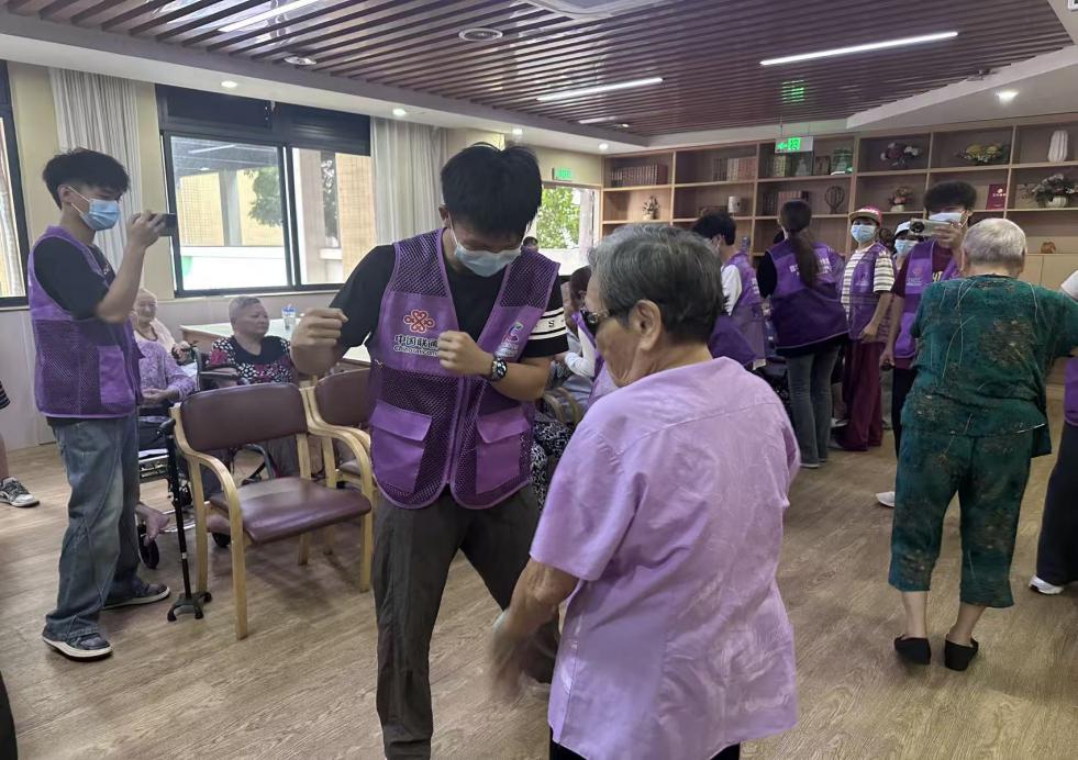 活动开始,志愿者们带领长者们一起跳起了欢快的手势舞。随着轻快的音乐节奏,大家伸出手、摆动身体,脸上洋溢着灿烂的笑容。老人们虽然动作稍显迟缓,但都认真投入,现场气氛热烈而融洽。