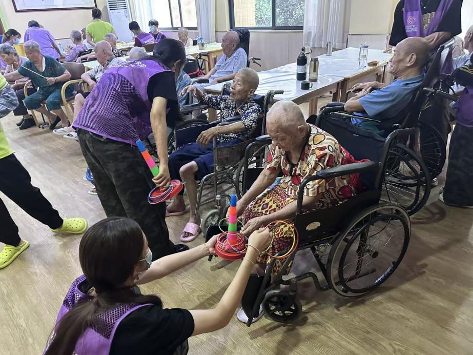 除了手势舞,志愿者们还与长者们准备了丰富多样的娱乐项目。在棋牌室里,长者们围坐在一起,有的专注地打着麻将,有的认真地下着象棋,还有的沉浸在斜方棋的对弈中。每一局都充满了策略与智慧,长者们时而眉头紧锁思考对策,时而开怀大笑庆祝胜利。套圈区域也十分热闹,长者们手持套圈,瞄准目标,全神贯注地投掷,每当套中奖品时,都会引来一阵欢呼声。