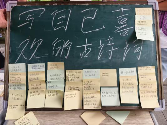 短短一小时内,五彩斑斓的便利贴便贴满了整块黑板,形成一道独特的“诗意风景线”。从“床前明月光,疑是地上霜”的经典咏叹,到“长风破浪会有时,直挂云帆济沧海”的豪情壮志,一句句诗词穿越千年,在便利贴上焕发新的活力。大家在书写与观赏中感受诗词之美,在交流与分享中传递文化温度。