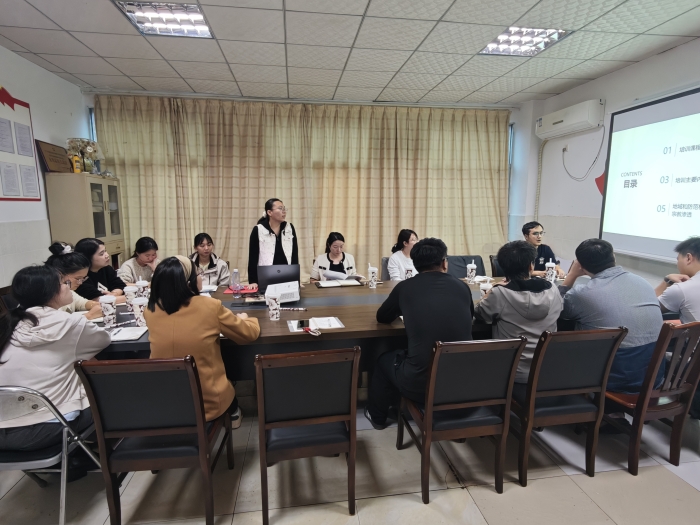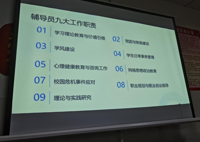 会上,邀请了辅导员高畅老师将参加省级培训学习情况进行分享。分享内容紧密围绕辅导员九大工作职责,从AI赋能高校学生工作与网络思政、高校学生日常管理、对高校学生心理危机的理解与干预等前沿议题出发,梳理了“法理情”相结合的管理艺术与“一站式”学生社区综合服务模式,强调通过“关口前移、重心下移”实现精细化服务与网格化管理。针对心理健康教育、职业规划等核心职责,简要讲解如何构建“家校社”协同育人机制,扮演好学生的“知心人、热心人、引路人”,实现对学生的全过程、全方位关怀引导。